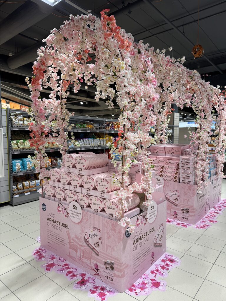 Meil oli au osaleda Fazer Eesti Geisha kommide kampaaniate väljapanekutel Eesti suuremates kauplustes. Roosade kirsiokstega kaetud kaarte tegemine oli puhas loominguline rõõm.